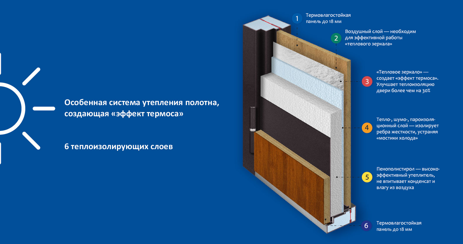 - Исключили «мостики холода» в полотне – полотно двери не промерзает при t°до -30°С.