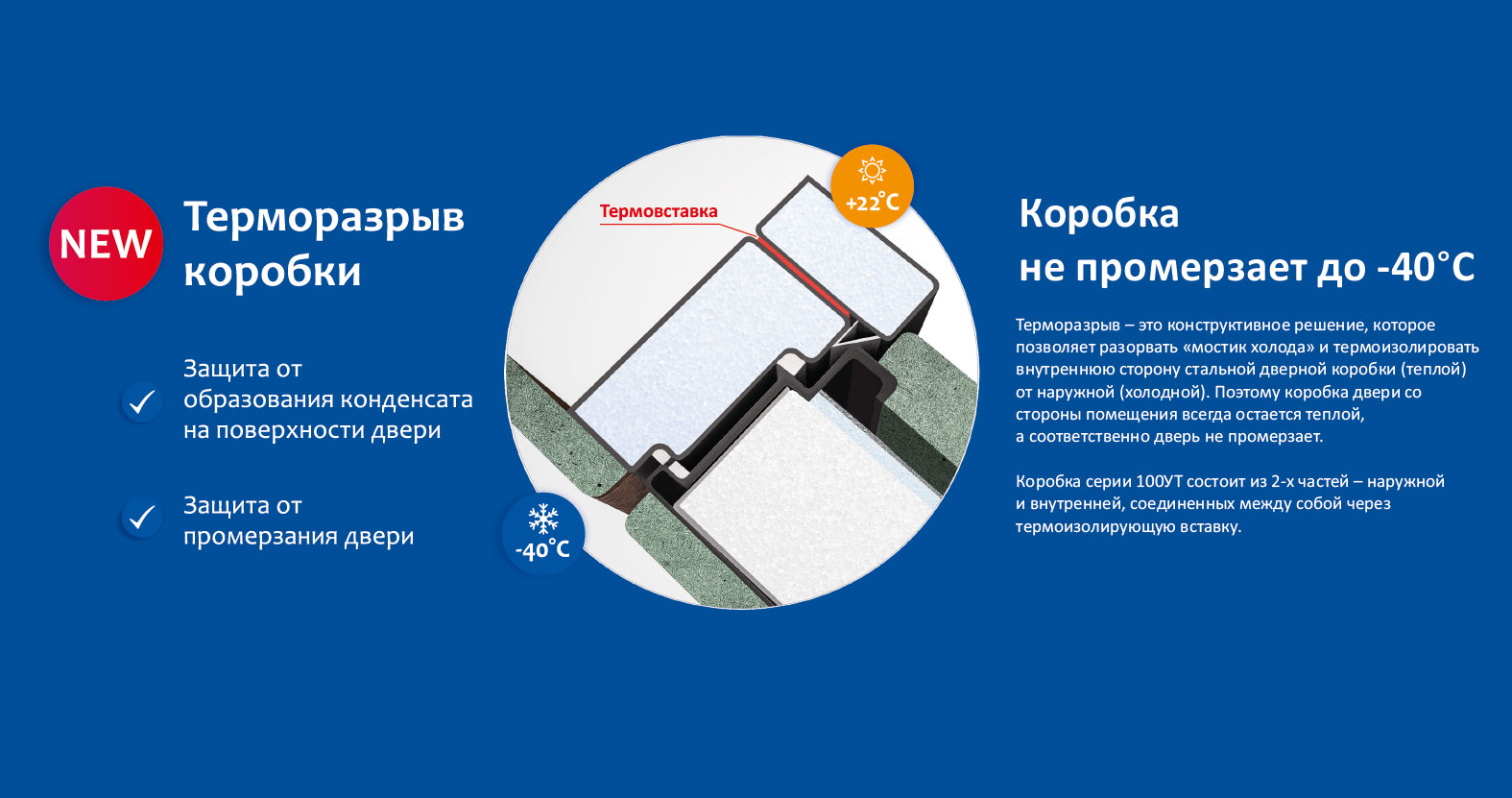 - Применили технологию терморазрыва в коробке. Он изолирует внутреннюю сторону коробки от наружной, в результате коробка двери не промерзает даже при низкой температуре до -40°С.