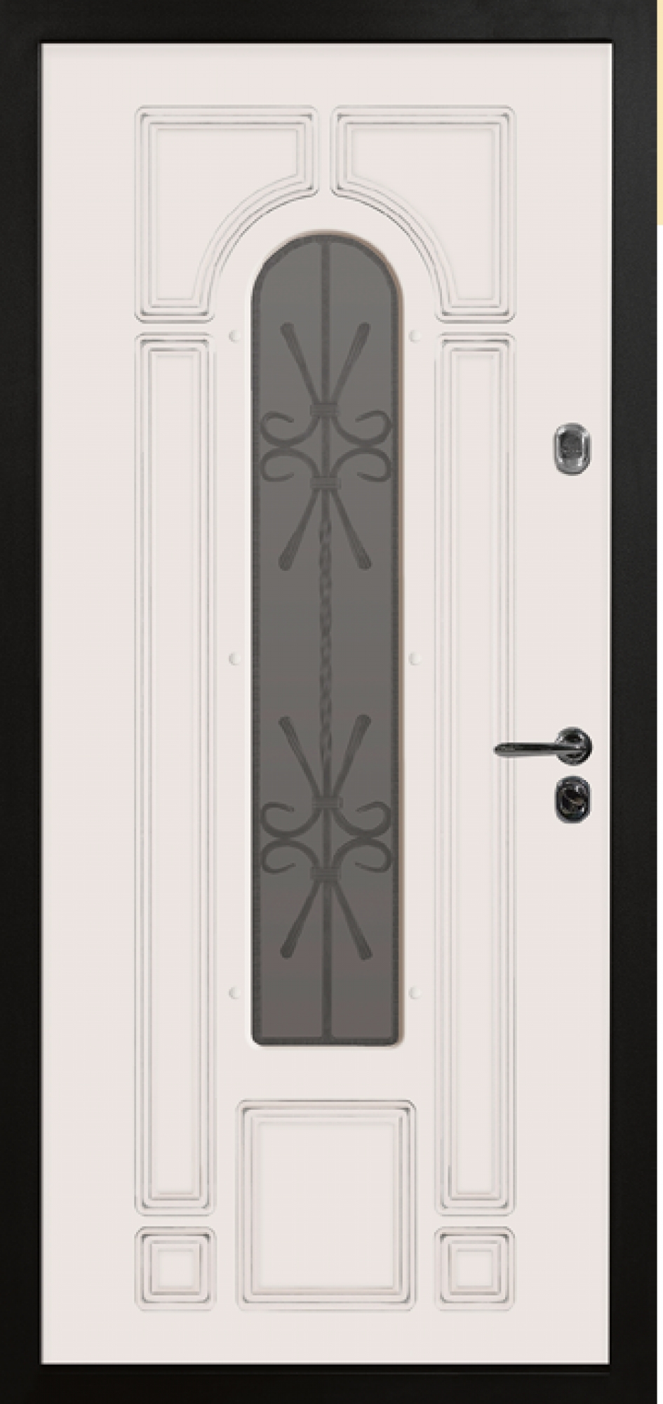 Модель «Ксанти» — современная классическая входная дверь с роскошным стеклопакетом, инкрустированным кованой защитной решеткой, сплетённой в интересный узор.