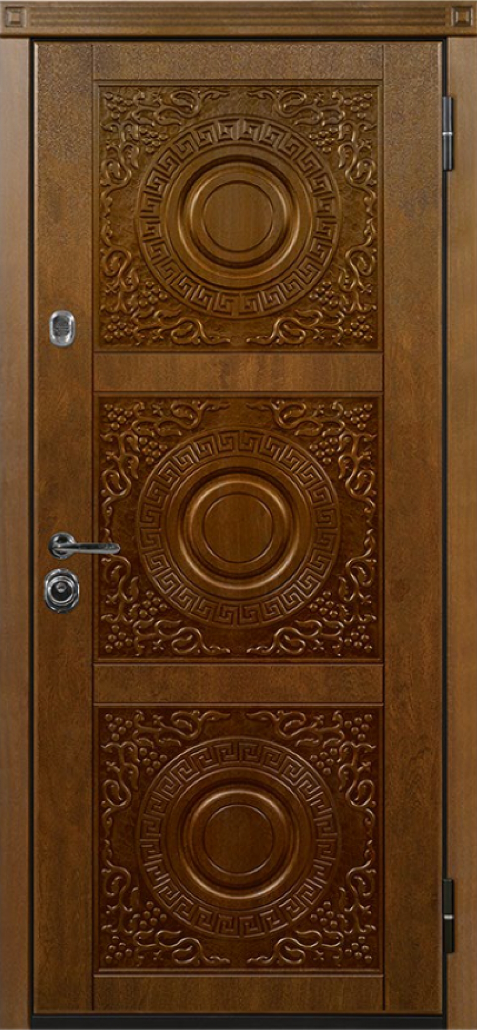 Модель «Богема» — элегантная входная дверь выполнена в стиле модерн с изящной фрезеровкой в форме вензелей и монограмм, которые придают полотну великолепный и аристократичный внешний вид. Они привлекают особое внимание четкой прорисовкой в сочетании с великолепной патиной. Технология SteelTex: защищает дверь от механических повреждений.